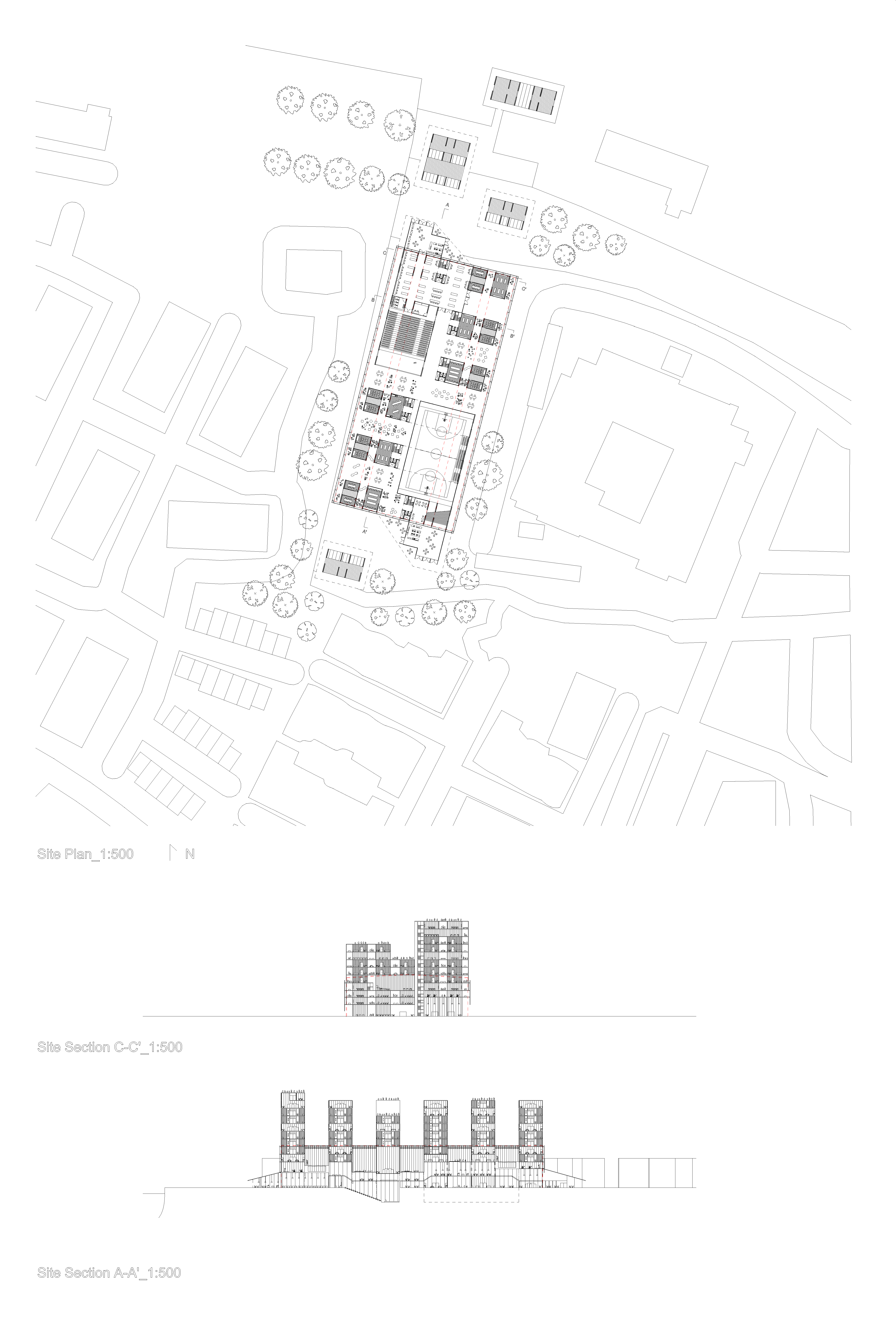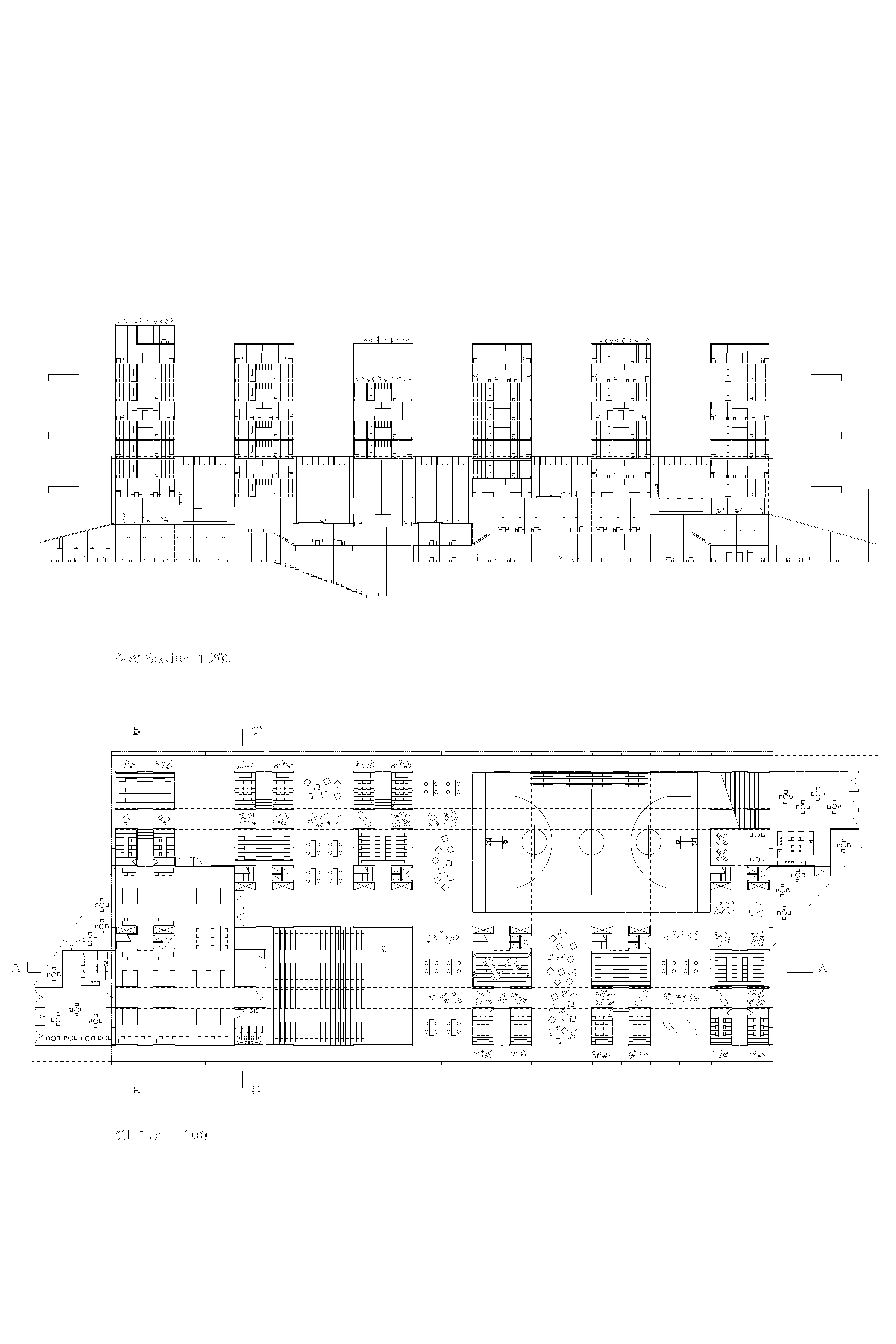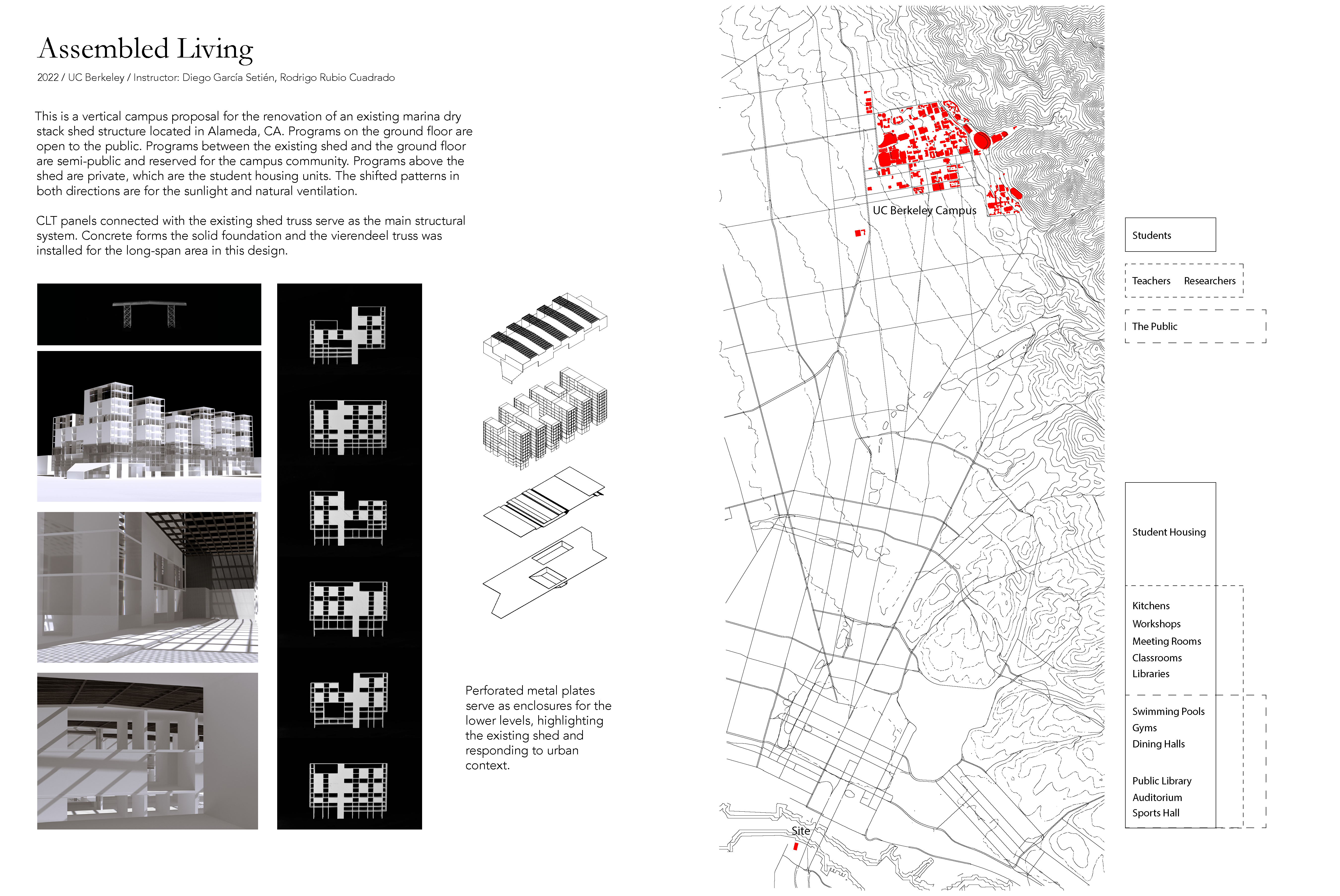 This is a vertical campus proposal for the renovation of an existing marina dry stack shed structure located in Alameda, CA. Programs on the ground floor are open to the public. Programs between the existing shed and the ground floor are semi-public and reserved for the campus community. Programs above the shed are private, which are the student housing units. The shifted patterns in both directions are for the sunlight and natural ventilation.