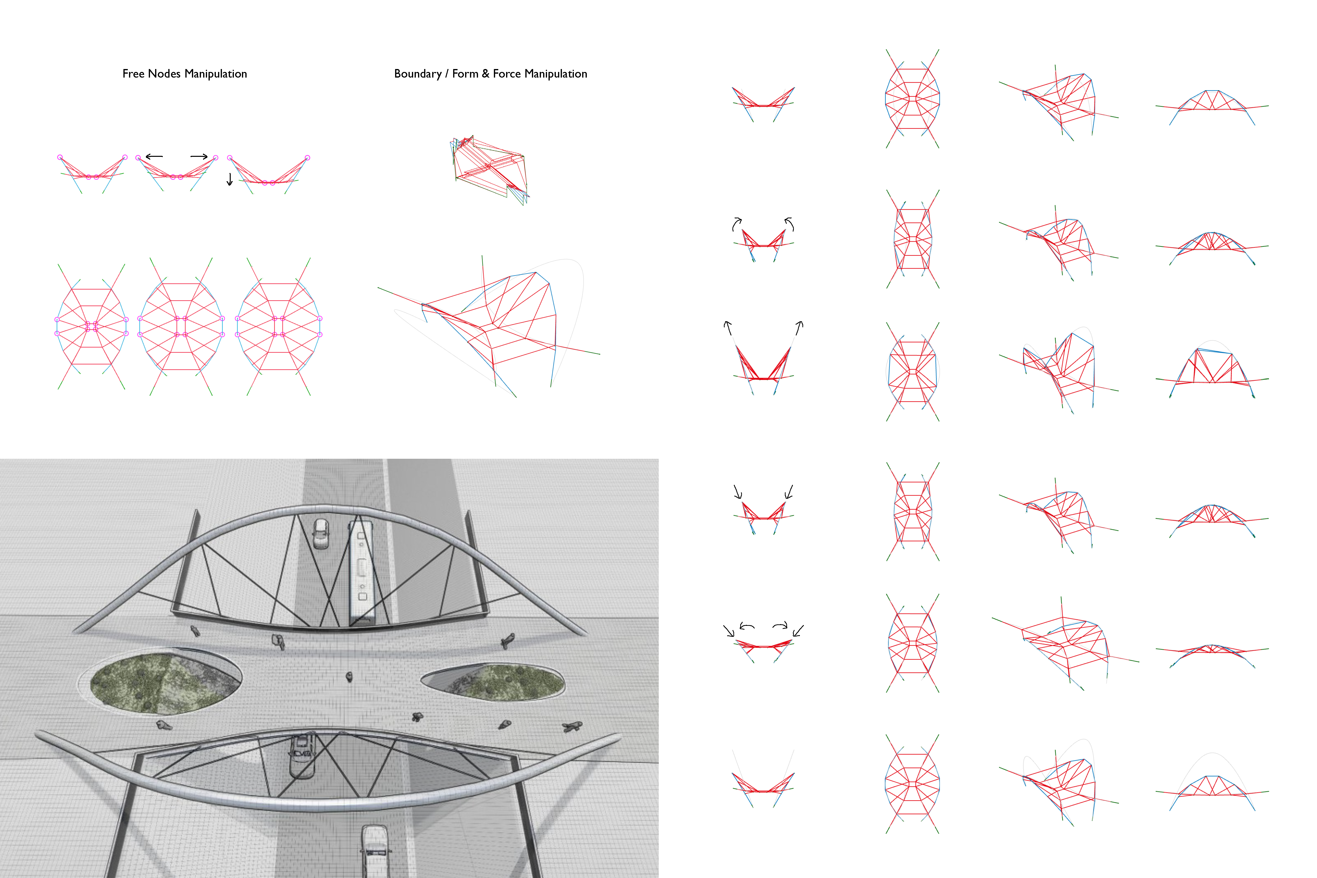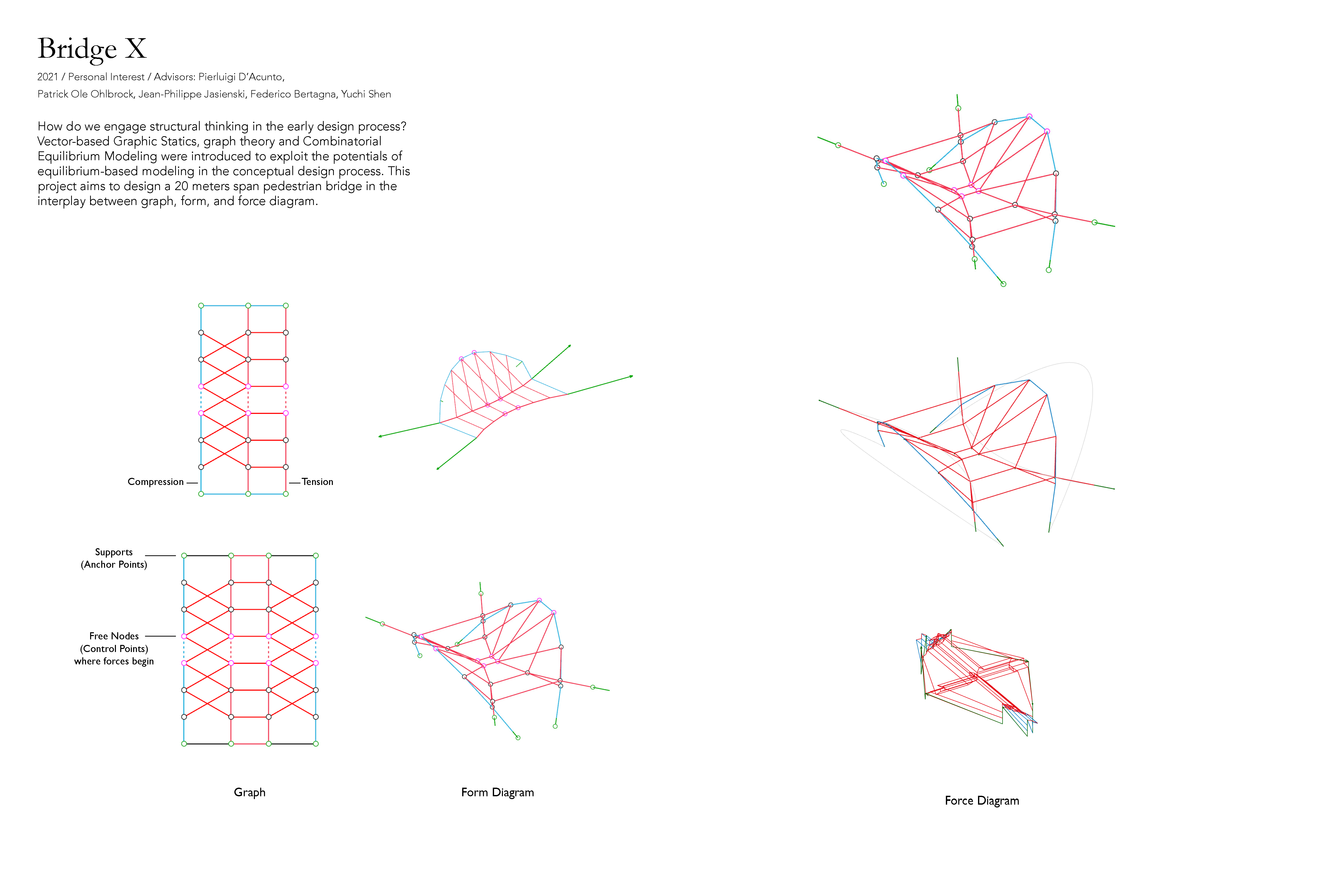 How do we engage structural thinking in the early design process? Vector-based Graphic Statics, graph theory and Combinatorial Equilibrium Modeling were introduced to exploit the potentials of equilibrium-based modeling in the conceptual design process. This project aims to design a 20 meters span pedestrian bridge in the interplay between graph, form, and force diagram.