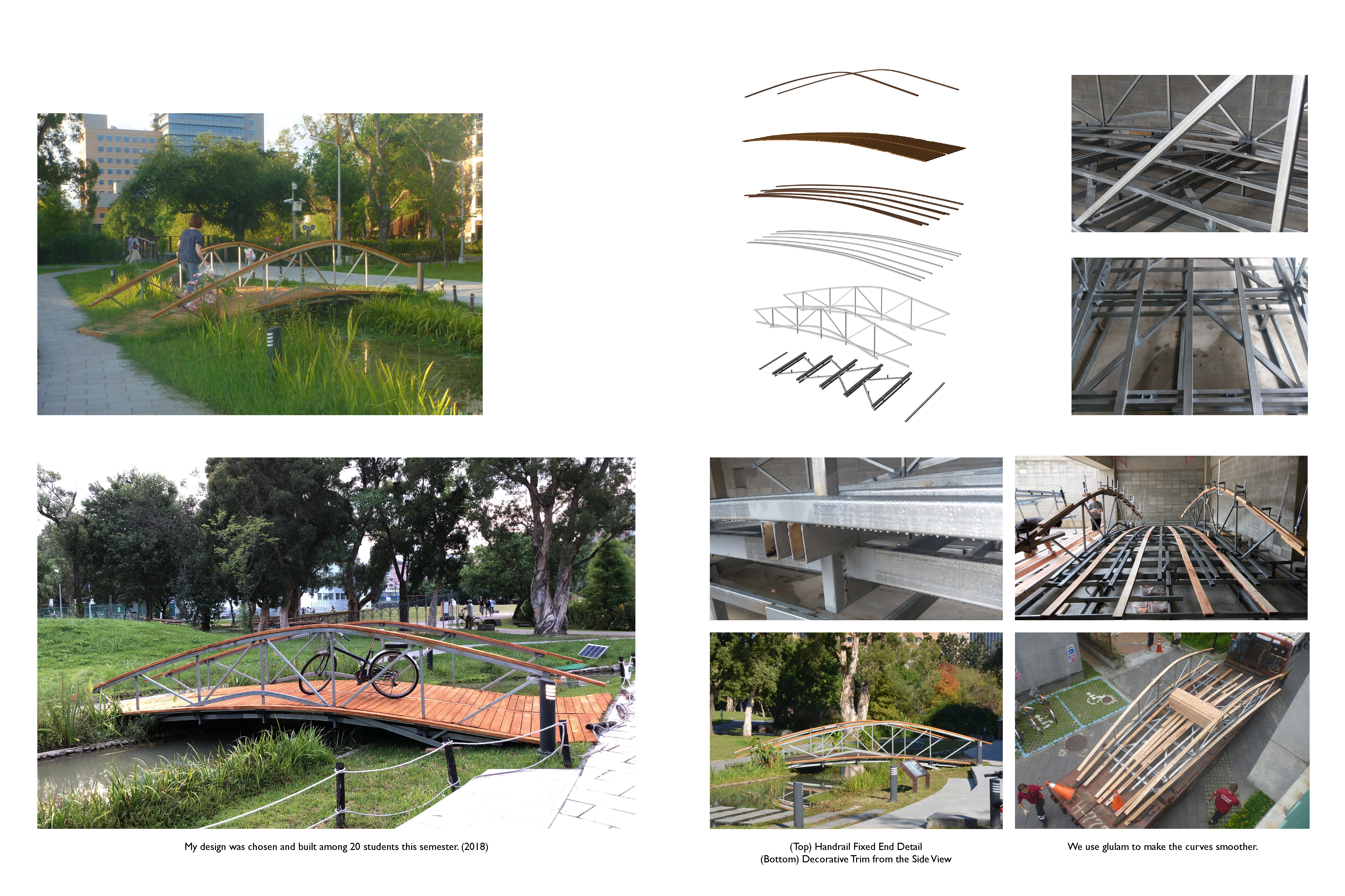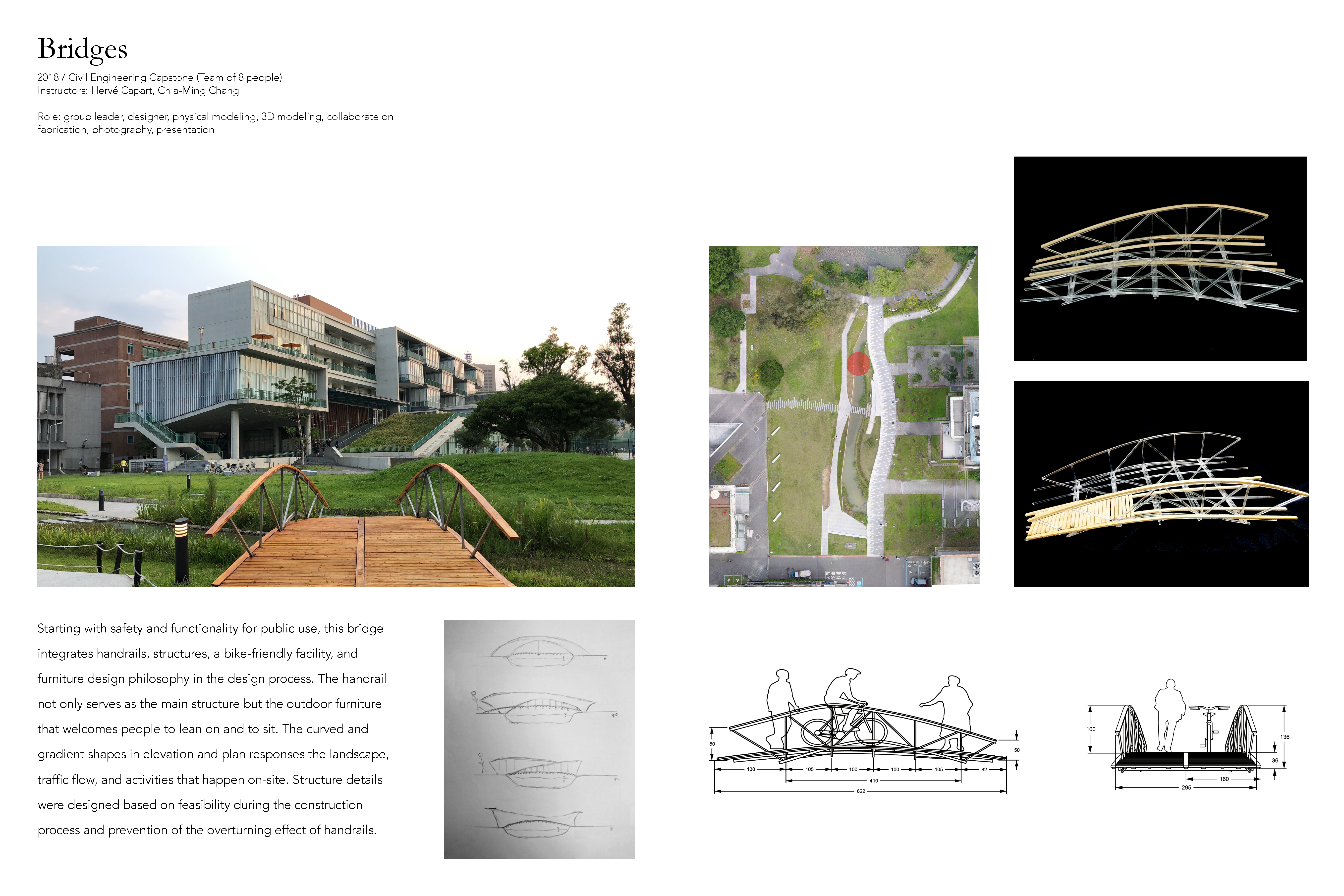 Starting with safety and functionality for public use, this bridge integrates handrails, structures, a bike-friendly facility, and furniture design philosophy in the design process. The handrail not only serves as the main structure but the outdoor furniture that welcomes people to lean on and to sit. The curved and gradient shapes in elevation and plan responses the landscape, traffic flow, and activities that happen on-site. Structure details were designed based on feasibility during the construction process and prevention of the overturning effect of handrails.