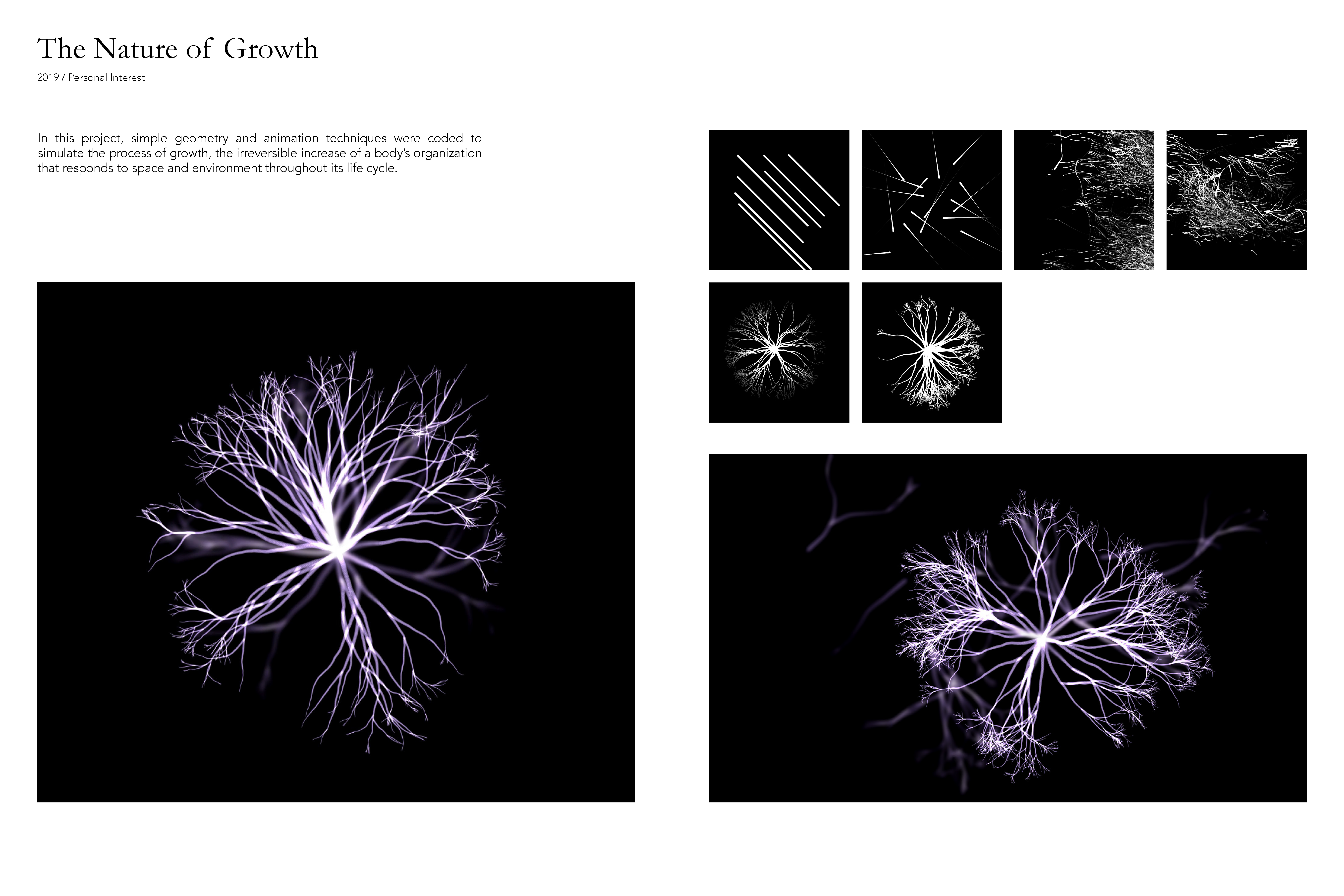 In this project, simple geometry and animation techniques were coded to simulate the process of growth, the irreversible increase of a body’s organization that responds to space and environment throughout its life cycle.